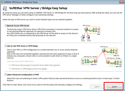 At the first time you connect to the VPN Server in Management Mode, the "Easy Setup" will appear. If you want to just only activate VPN Gate Service, click the "Close" button.
