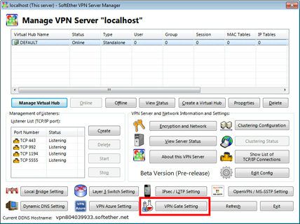 The top windows of VPN Server Manager. Click the "VPN Gate Setting" button.